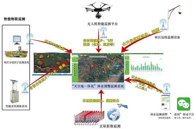 依据国家林业局制定的《林业发展“十三五”规划》中提出要“加强生态监测评价体系建设”,“深化遥感、定位、通信技术全面应用,构建天空地一体化监测预警评估体系,实时掌握全国生态资源状况及动态变化,及时发现和评估重大生态灾害、重大生态环境损害情况。”基于国内林业现状,结合当前林业科学前沿技术及产品解决方案,利用卫星遥感、无人机、物联网、移动采集、通信技术,拟提出“林业信息化应用建设思路”,围绕“天空地”一体化林业监测预警体系,设计解决当前林业监测预警实际业务需求的项目应用。