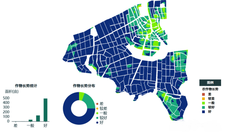 农作物长势遥感监测。数海信息高分遥感智慧农业综合管理平台实现了作物长势特征的大面积监测,并实现分级(长势好、长势较好、长势一般、长势较差、长势差)显示。根据用户的需求,可实现不同精度的遥感数据服务。